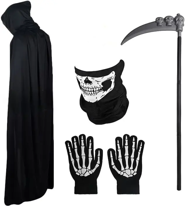 Death Cloak Suit Halloween Cosplay Costume Grim Reaper Prop Ghost Head Scythe Skull Scarf Glove Adult Kids Halloween Decoration